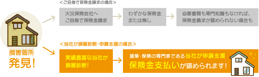 そして、何より保険会社から支払ってもらった保険金の金額内の工事しかしませんのでお手出しは全くありません。その代わり、その金額内で確実な工事を必ずします。